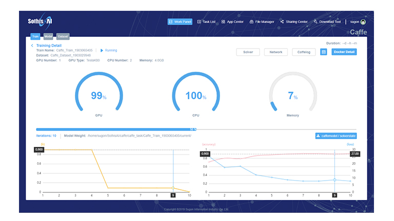 曙光人工智能服務平臺SothisAI 系列產品極大的降低了用戶切入深度學習領域的經濟成本和技術成本,提供一套容器化的集群調度以及深度學習私有云服務方案。SothisAI 采用Slurm、K8S雙調度引擎融合容器彈性擴展技術的方式,實現了資源的動態高效調度,應用的快速分發,和進程級隔離。支持多種編譯環境及常見深度學習框架,如Caffe、TensorFlow、PyTorch等。提供了豐富的數據集和典型網絡模型,同時支持內容分享和應用發布功能,協助構建平臺微生態。最終幫助用戶將更多的精力聚焦至垂直應用的開發和優化。SothisAI平臺目前已在多所高校、研究中心部署使用。